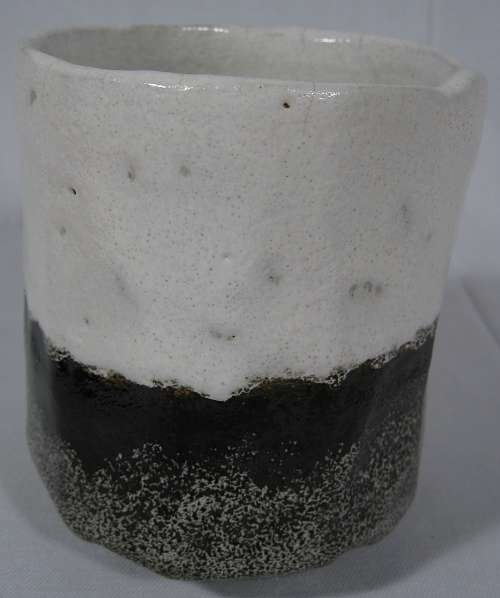 Kyoto ware cylindrical tea bowl in style of koetsu, attributed to eiraku zengoro workshop 19th century, stoneware with white slip and black pigment under this is a wan shaped tea bowl made of coarse, unrefined clay with a high content of iron oxide.